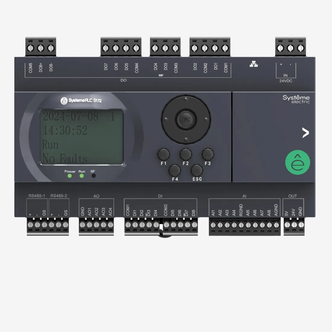 SM172PS11BDM | ПЛК S172; 24 VDC; дисплей; 28 IO: 8 DI, 8 DO (6 реле, 2 SSR), 8 AI, 4 AO, 2xRS485, 1xRJ45, Systeme Electric
