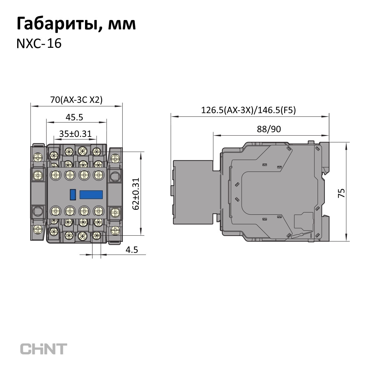 Next NXC — серия контакторов Chint с номинальным током до 630А. В серию входят универсальные контакторы, а также миниатюрные контакторы NXC-M высотой 58 мм. Универсальные контакторы NXC предназначены для дистанционного управления, частых включений и выключений электрических цепей, в том числе электродвигателей в тяжёлом режиме работы. Поддерживают установку дополнительных контактов, механических блокировок, приставок выдержки времени, модулей подавления бросков напряжения и предусматривают сборку реверсивного контактора