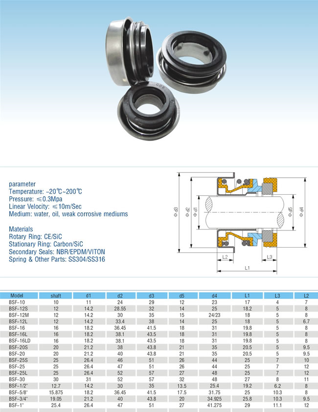 Механическое торцевое уплотнение BSF-16LD c произвольным направлением вращения. Бывает как в метрических, так и дюймовых размерах. BSF-16LD отлично подойдут для мотопомп перекачивающих воду.